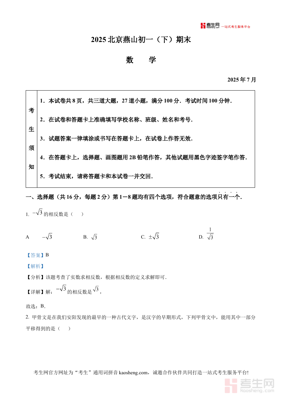 《精品解析:北京市燕山地区2024-2025学年七年级下学期数学 期末数学试题(解析版)》是针对北京市燕山地区特定学年、学段与学科的期末检测备考资料。它聚焦于七年级下学期数学学科的期末测评场景,结合当地教育教学实际情况,为使用者提供与该区域期末数学考试直接相关的解析内容,是贴合燕山地区学情的针对性备考资源,能够帮助使用者快速对接本地期末考的考查需求与评价标准。