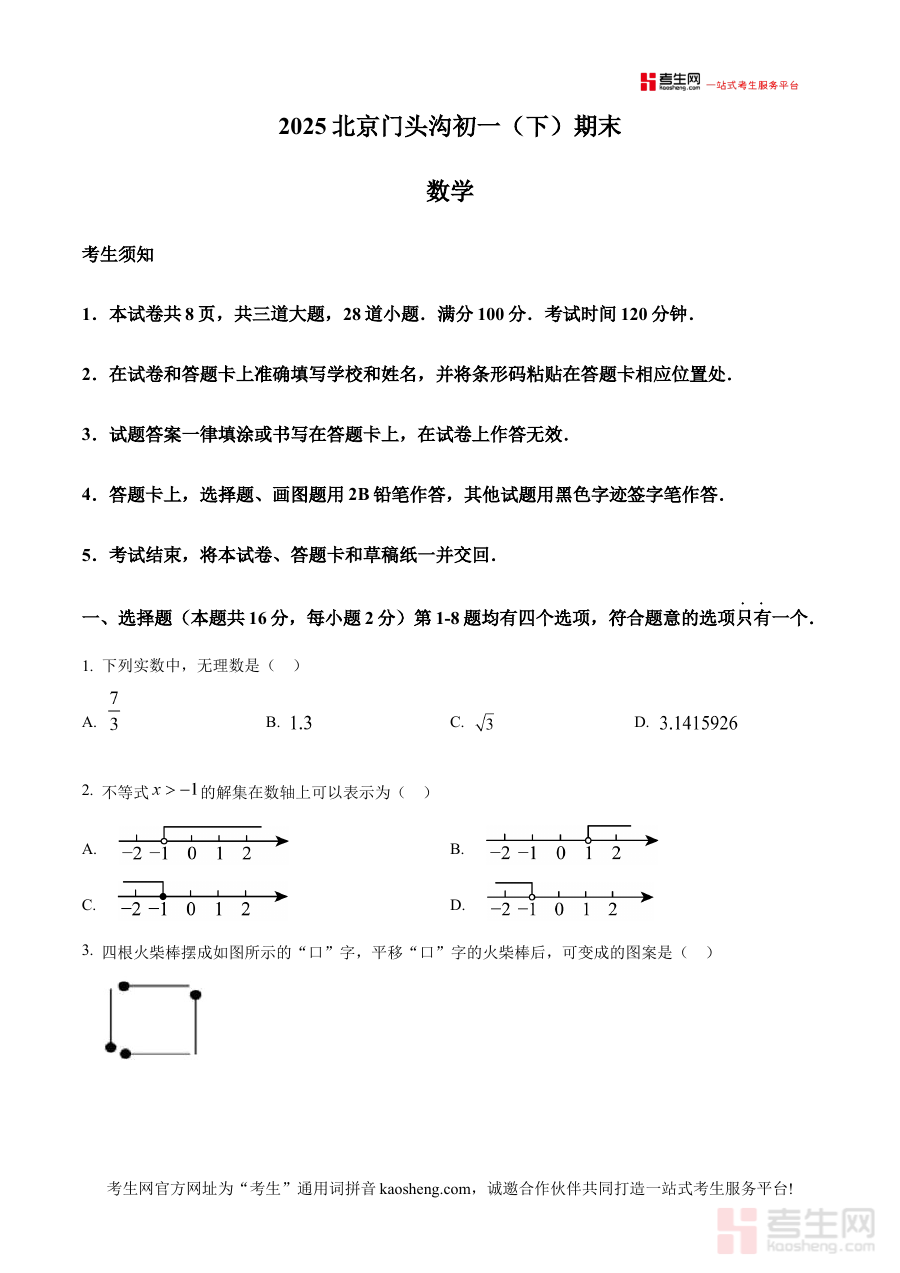 《精品解析:北京市门头沟区2024-2025学年七年级下学期期末数学试题(原卷版)》是针对北京市门头沟区特定学年段七年级下学期数学期末检测的原卷形式备考资料,精准匹配该地区2024至2025学年七年级数学期末考试的官方命题框架与考查范围。作为区域化的期末备考资源,它能够帮助使用者直接接触到与当地期末考形式完全一致的试题载体,清晰感知该地区七年级下学期数学期末检测的整体结构与考查方向,为后续的备考活动提供真实可靠的参考依据。