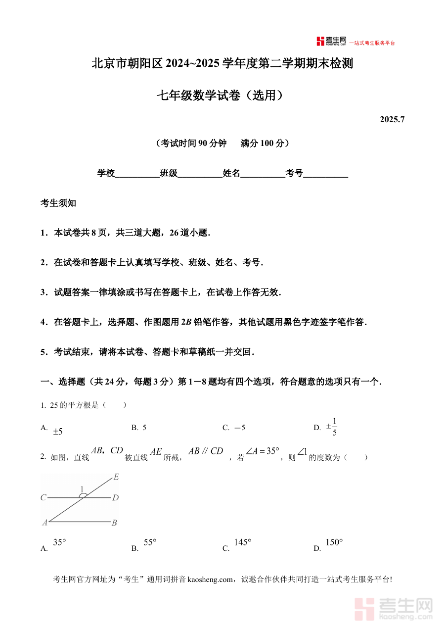 《精品解析:北京市朝阳区2024-2025学年七年级下学期期末数学试题(原卷版)》是针对北京市朝阳区2024至2025学年七年级下学期期末数学考试编制的标准化备考资料。该资料紧密贴合朝阳区初中数学教学进度与期末评价要求,完整呈现该学期期末数学考试的原卷形态,为使用者提供与真实考试场景高度一致的练习载体。