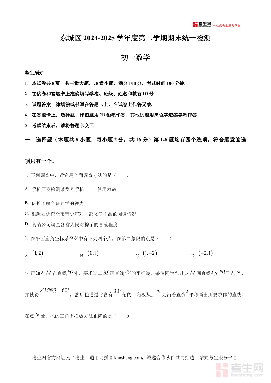 《精品解析:北京东城区2024-2025学年七年级下学期期末数学试卷(原卷版)》是针对北京东城区2024至2025学年七年级下学期数学期末检测的官方原卷形式备考资料。它依托该地区当学期数学教学进度与期末考查标准编制,能够真实反映东城区七年级数学期末测试的命题方向与考查范围,为使用者提供贴合本地教学实际的备考依据,帮助使用者提前熟悉考试形式与本地命题特点。