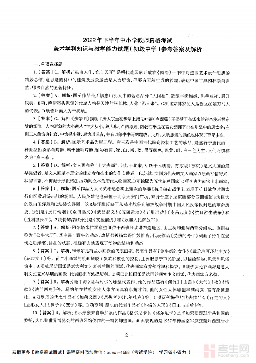 《2022年下半年教师资格证考试《初中美术》题解(OCR)》是针对2022年下半年国家教师资格证初中美术学科考试推出的配套题解资料,OCR标识表明其内容经过专业文字识别处理,可直接用于数字化查阅与使用。作为教师资格证备考体系中的重要辅助资源,它聚焦该次考试相关题目的解析支持,为考生提供精准的内容参考,助力考生快速获取考试相关的解析信息。
