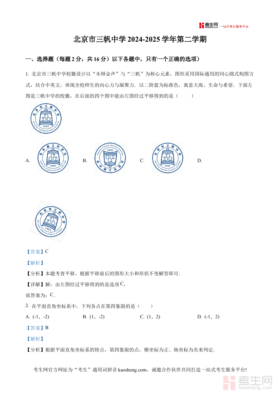 《精品解析:北京市三帆中学2024-2025学年七年级下学期期末测试数学试题(解析版)》是针对北京市三帆中学2024至2025学年七年级下学期数学学科期末测试的专业配套解析资料,精准对应该学年七年级下学期期末阶段的数学学习成果检测场景,为相关使用者提供全面且深入的试题解析服务与备考支持。