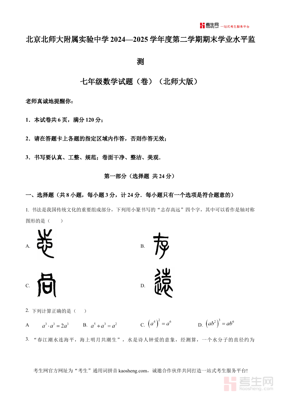 《精品解析:北京市北京师范大学附属实验中学2024——2025 学年下学期期末学业水平监测七年级数学试题(卷)(北师大版)(原卷版)》是针对北京市北京师范大学附属实验中学2024至2025学年下学期七年级数学期末学业水平监测的配套备考资料,依托北师大版教材体系,贴合该校期末监测的命题方向与考查重点。
