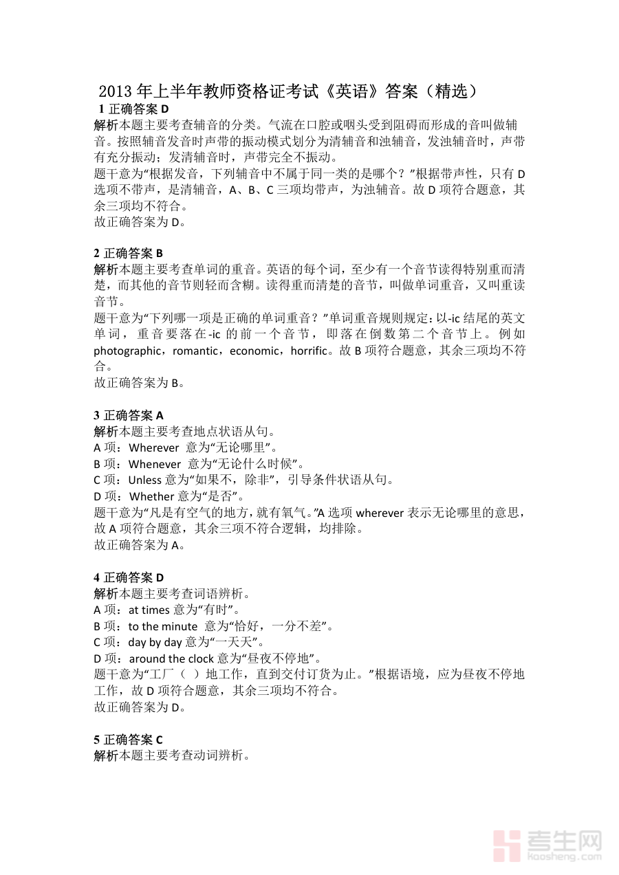 《2013年上半年教师资格证考试《初中英语》答案(精选)》是针对2013年上半年全国教师资格证考试初中英语科目的专项备考资料。该资料聚焦于此次考试初中英语科目的答案内容,为备考者提供了对应考试的官方或权威参考依据,帮助备考者快速获取该次考试的相关答案信息,是备考过程中用于核对作答结果、了解考试评分标准的重要辅助材料之一。