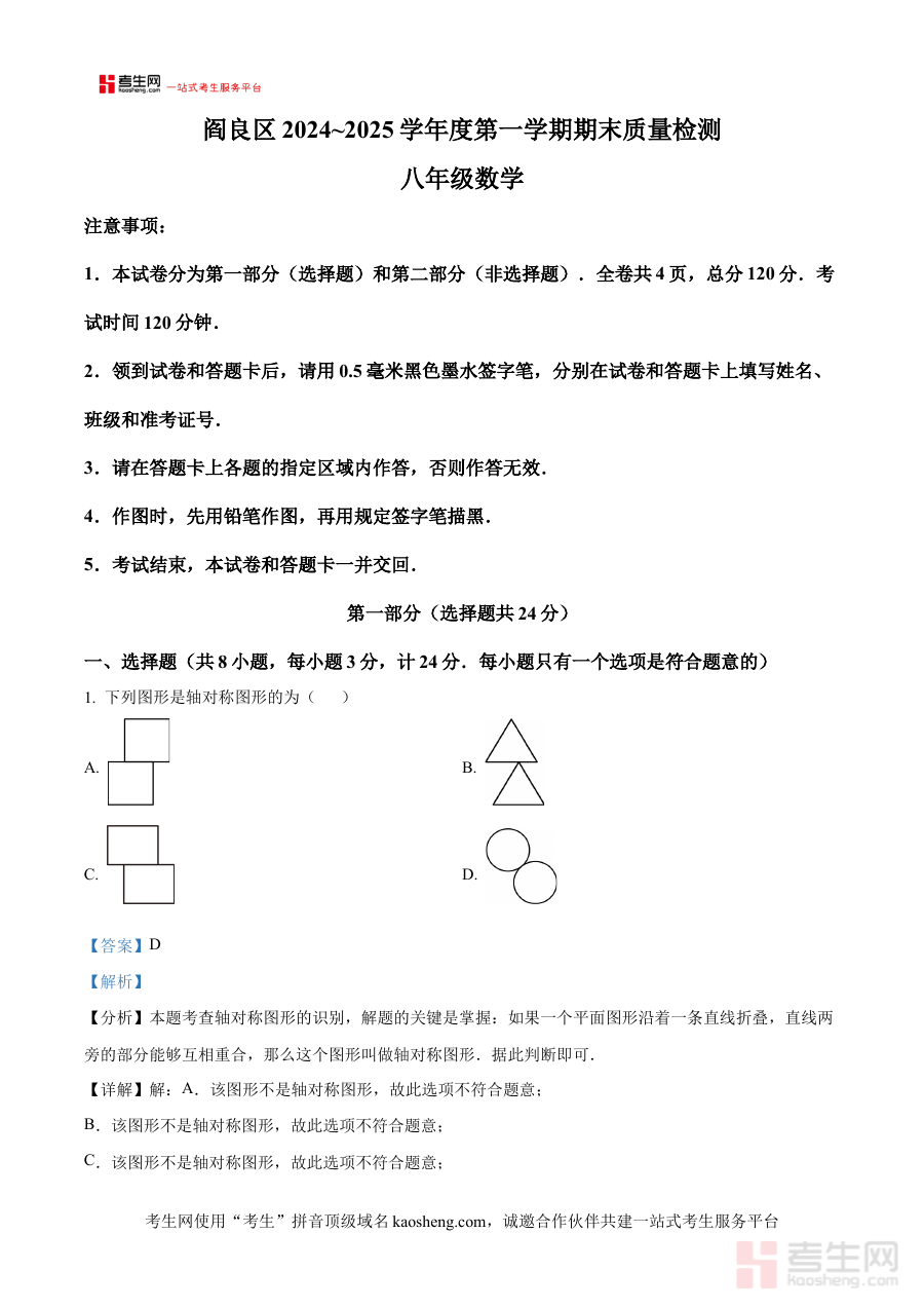 《精品解析:陕西省西安市阎良区2024-2025学年八年级上学期期末调研数学试题(解析版)》是面向陕西省西安市阎良区特定教育阶段与学科的期末调研考试专属配套资料。该资料紧密围绕2024-2025学年八年级上学期数学学科的期末调研需求,严格契合当地教育行政部门及教研机构制定的期末调研考试的考查范围、能力要求与评价导向,为使用者提供高度贴合区域教学实际与考试特点的专业备考资源。