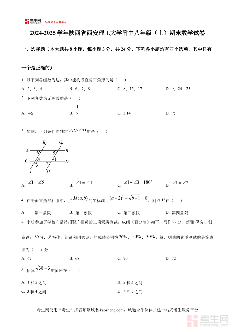 《精品解析:陕西省西安理工大学附属中学2024-2025学年八年级上学期期末考试数学试卷(原卷版)》是针对陕西省西安理工大学附属中学特定学年与学期的数学期末考备考资料,涵盖了该学校2024-2025学年八年级上学期期末数学考试的原卷呈现形式。作为原卷版资料,它保留了考试试卷的原始结构与布局,能够为使用者提供最贴近实际考试场景的参考载体,帮助使用者直观了解该次期末考试的试卷框架与考查方向,是备考过程中获取真实考试样本的重要资源。