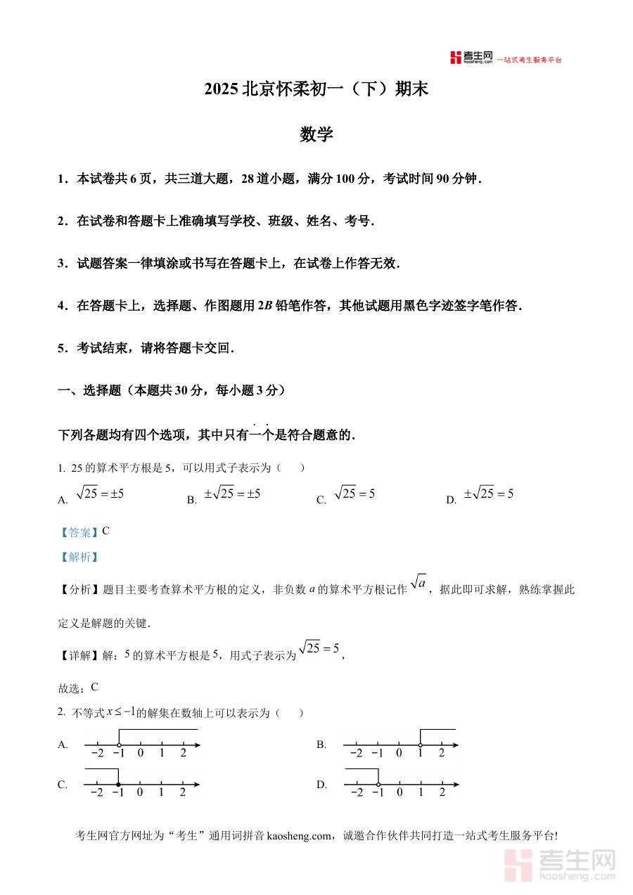本资料适用于北京市怀柔区2024—2025学年下学期的七年级学生及数学教师,学生可借助其巩固阶段知识、优化答题策略,教师可将其作为期末复习指导的参考工具;通过对该试卷解析的学习,使用者能更好地适应本地期末测试要求,强化知识整合运用能力,为期末取得良好成绩提供有力支撑。