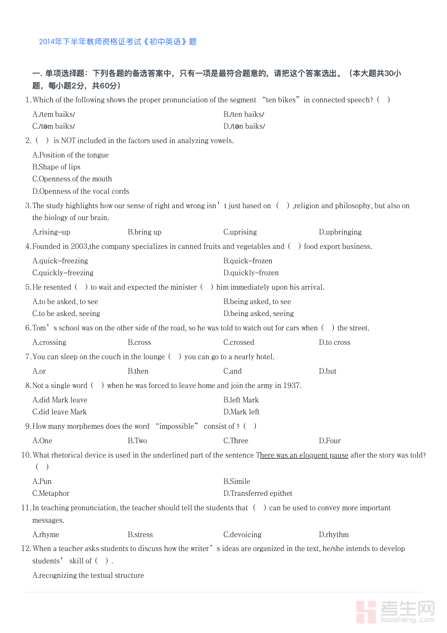 《2014年下半年教师资格证考试《初中英语》题》是2014年下半年针对初中英语教师资格证考试推出的备考资料,其内容设计与该年度该科目的考试方向紧密关联,能够为备考者提供贴合当年考试场景的练习素材,帮助备考者熟悉考试的整体结构与核心要求,为后续的复习规划提供参考依据。