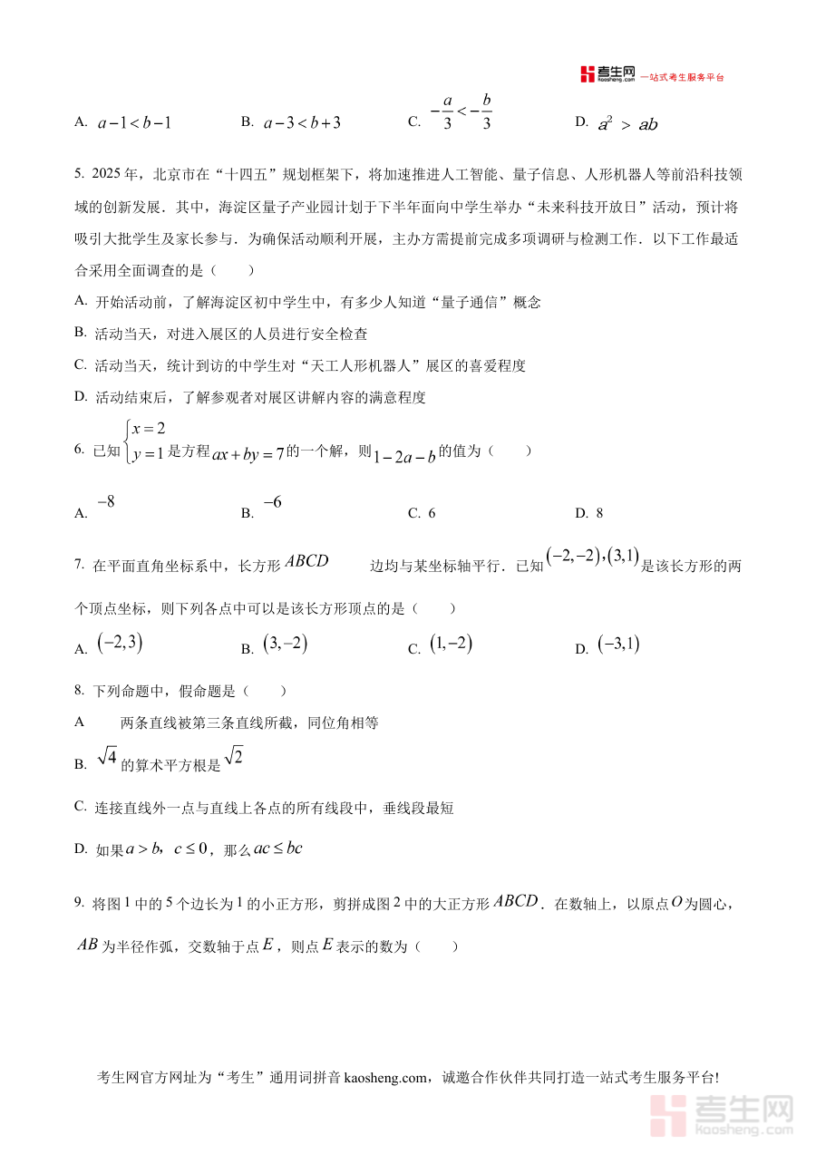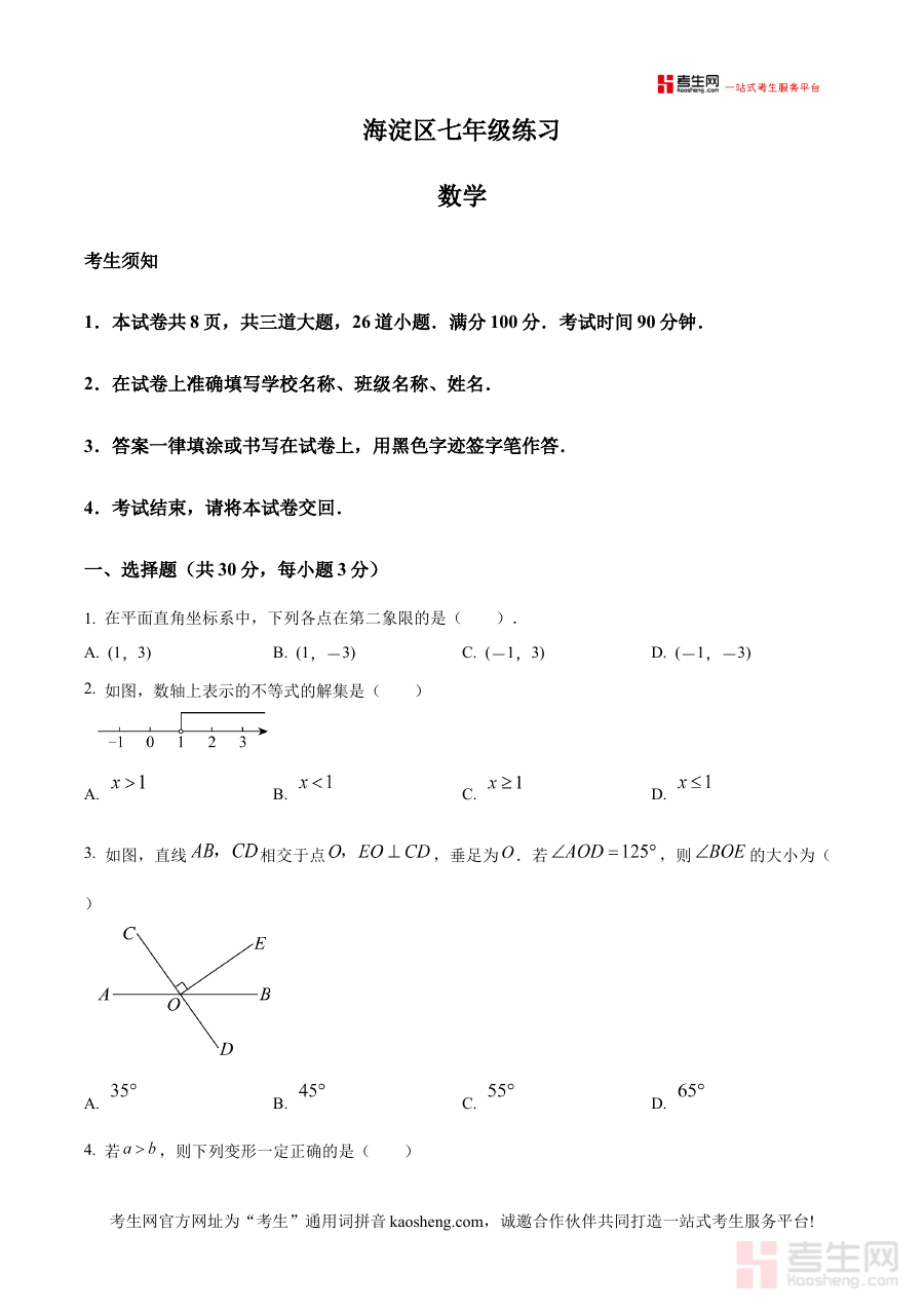 《精品解析:北京市海淀区2024-2025学年七年级下学期期末数学试题(原卷版)》是针对北京市海淀区2024至2025学年七年级下学期期末数学考试的专项备考资料,聚焦该地区特定学年段的数学期末测评需求,为使用者提供贴合区域教学进度与考试要求的原卷资源。
