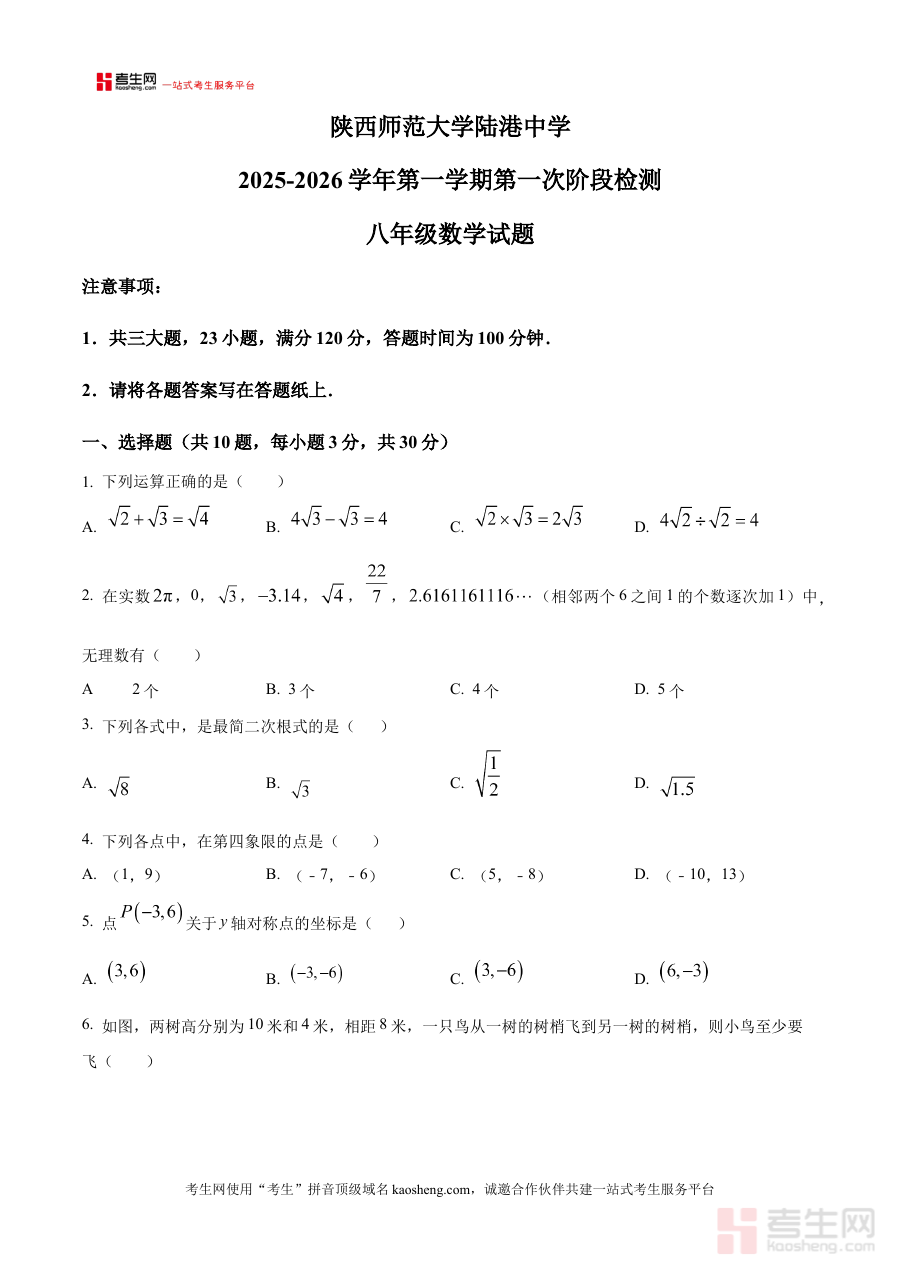 《精品解析:陕西省西安市陕师大陆港中学2025-2026学年八年级上学期第一次月考数学试题(原卷版)》是针对陕西省西安市陕师大陆港中学特定学年段与考试节点的数学学科备考资料,聚焦于2025-2026学年八年级上学期首次月考这一关键阶段性检测场景,以原卷版形式完整还原此次月考的试题呈现形态,为使用者提供与实际考试高度契合的试题载体,帮助其提前熟悉考试的整体结构与命题方向,为后续针对性备考搭建基础框架。