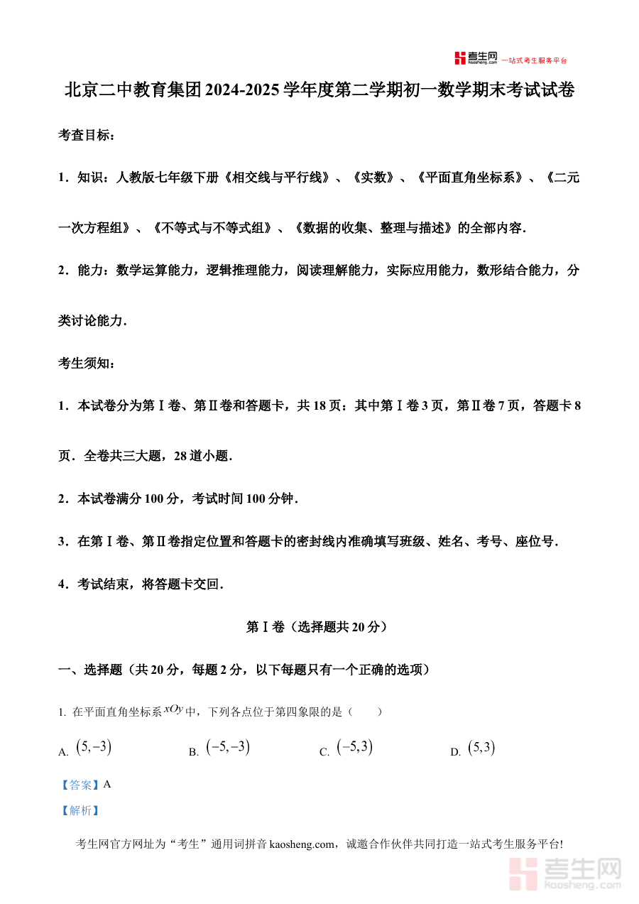 《精品解析:北京市第二中学教育集团2024-2025学年七年级下学期期末数学试卷(解析版)》是面向北京市第二中学教育集团2024-2025学年七年级学生的期末数学考试配套备考资料,精准对应该学年七年级下学期数学学科的期末检测场景,为使用者提供专业的试卷解析服务。
