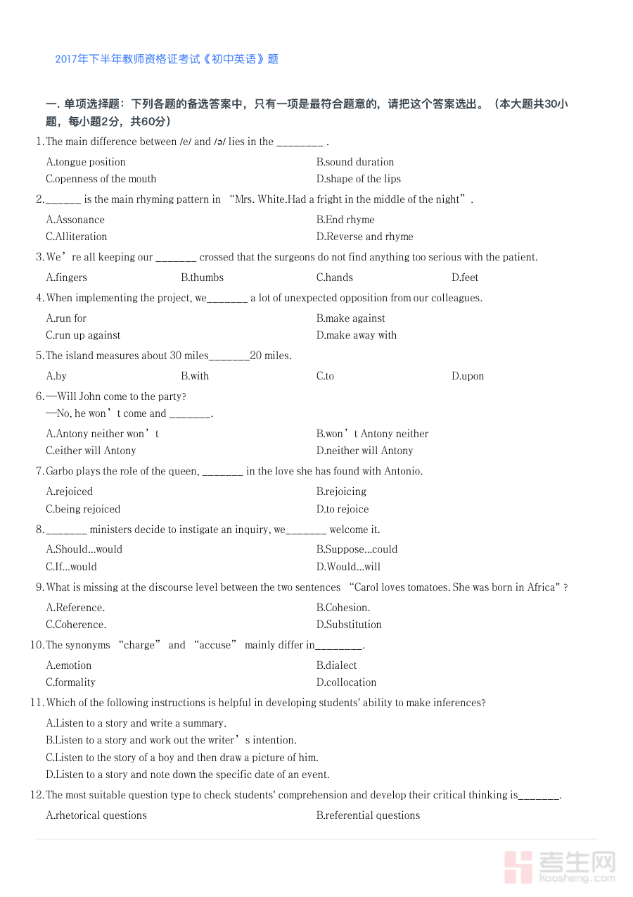 《2017年下半年教师资格证考试《初中英语》题》是2017年下半年针对初中英语学科教师资格申请者设计的官方考试相关试题资料,属于国家教师资格证考试体系中的学科专业知识考核范畴,为备考该科目考试的人员提供了贴合当年考试标准的实战参考素材。该资料严格遵循当年教师资格证考试的学科命题要求,能够帮助备考者直观感受考试的整体氛围与考核方向,是备考过程中不可或缺的参考资料之一。
