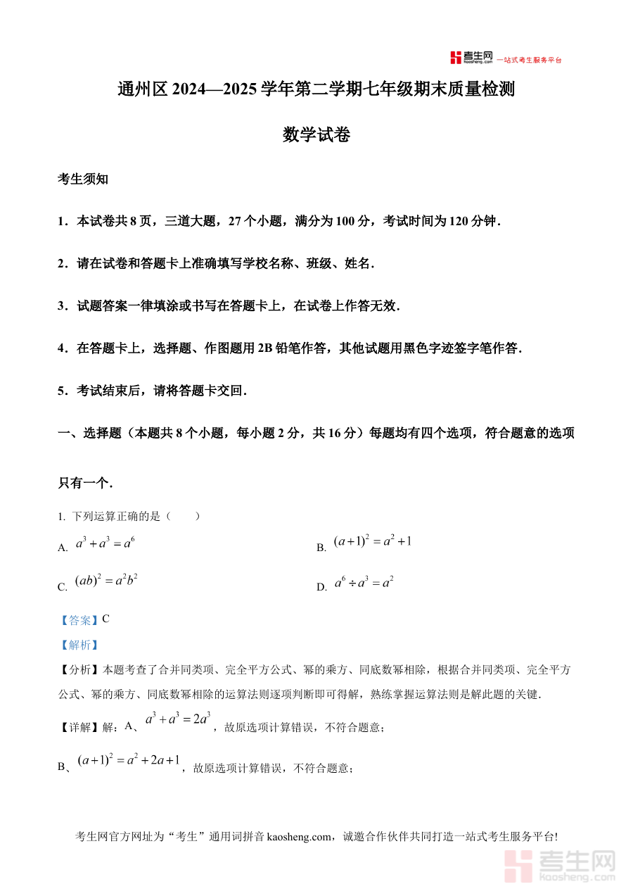 《精品解析:北京市通州区2024-2025学年下学期期末考试七年级数学试题(解析版)》是针对北京市通州区2024-2025学年下学期七年级数学期末考试的专项备考资料,精准对应该地区该学年下学期期末阶段的数学学科考查场景,为使用者提供与考试直接关联的解析类内容支持。