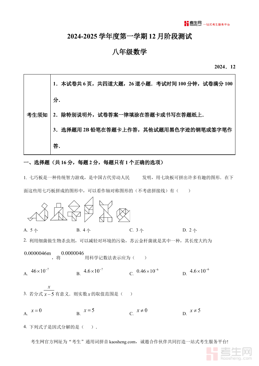 《精品解析:北京师范大学第二附属中学2024-2025学年上学期12月月考八年级数学试卷(原卷版)》是针对北京地区2024-2025学年上学期八年级数学学科12月月考的配套备考资料,紧密贴合该阶段教学进度与考试命题方向,为学生提供与实际考试场景高度一致的练习素材。