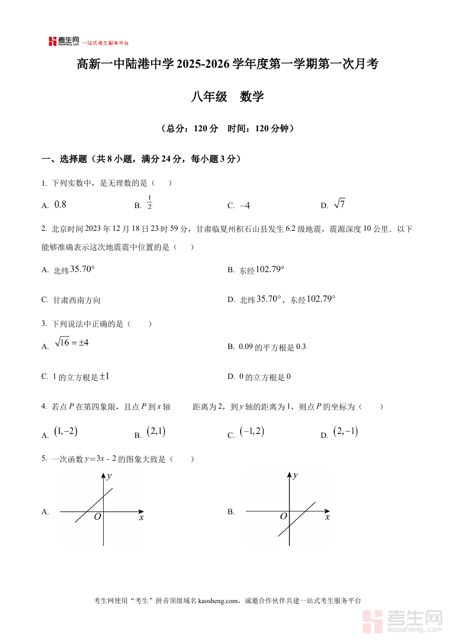 《精品解析:陕西省西安国际港务区高新一中陆港中学2025--2026学年上学期八年级数学10月月考试卷(原卷版)》是针对陕西省西安国际港务区高新一中陆港中学特定学年学期的数学阶段性考试资料。该资料对应2025-2026学年上学期八年级数学10月月考,完整呈现了该校该阶段数学考试的原卷内容,为相关师生提供了贴合本地校考实际的备考素材,能够帮助使用者直观了解该校八年级数学月考的命题背景与考试形式,是适配该校阶段性教学进度的重要备考资源。