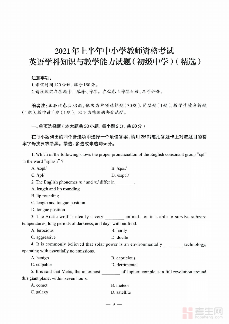 《2021年上半年教师资格证考试《初中英语》题(精选)》是针对2021年上半年初中英语学科教师资格证考试推出的专业备考资料。该资料聚焦初中英语教资考试的核心考查方向,整合了该次考试中的代表性题目,为考生搭建起与真实考试场景紧密衔接的练习平台,帮助考生提前熟悉考试的整体框架与命题特点,是备考过程中贴合考试实际需求的重要资源。