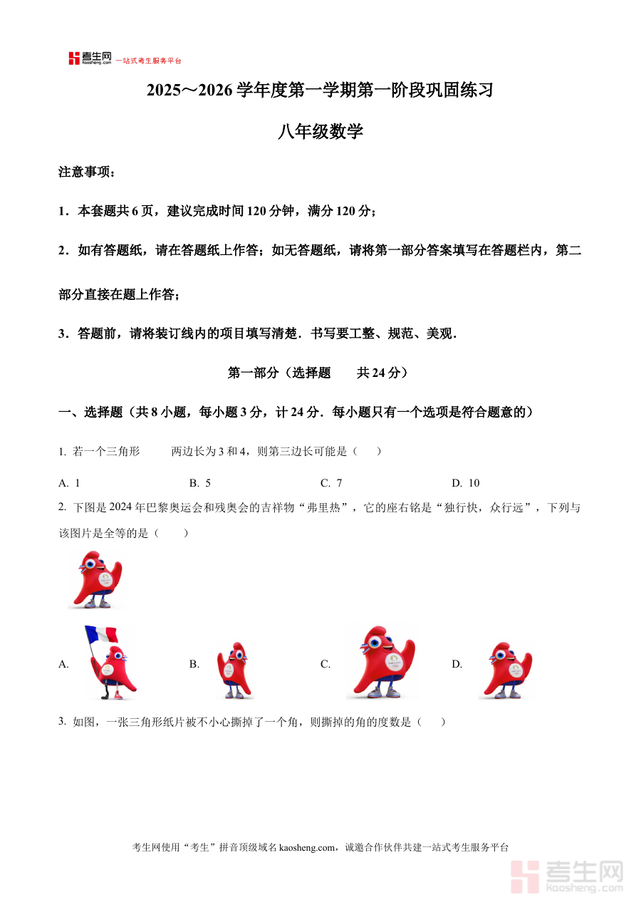 该原卷版资料的核心用途在于支撑学情诊断、备考规划及阶段检测。对于教师而言,它能帮助快速把握本次月考的试卷结构与考查方向,为分析学生学习状况提供真实可靠的测试载体,进而制定更具针对性的教学调整方案与后续备考计划;对于学生来说,通过接触原卷形式的试题,可以提前熟悉月考的命题风格与答题要求,有效检测自身在开学初期数学知识的掌握程度,发现学习中的薄弱环节。