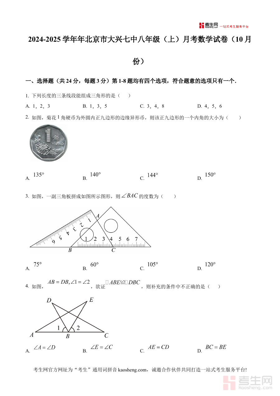 《精品解析:北京市大兴区第七中学2024-2025学年八年级上学期月考数学试卷(10月份)(原卷版)》是针对北京市大兴区第七中学2024-2025学年八年级上学期10月份数学月考的原卷版备考资料,明确对应特定学年、学段、学科及考试时间,为使用者提供该次月考的原始试卷形式,是贴合该校八年级学生阶段性学习情况的针对性资源。