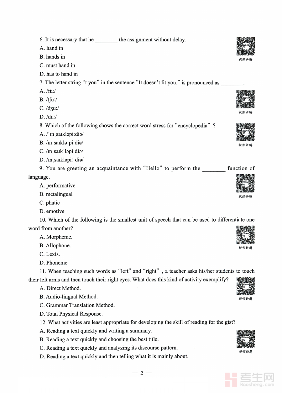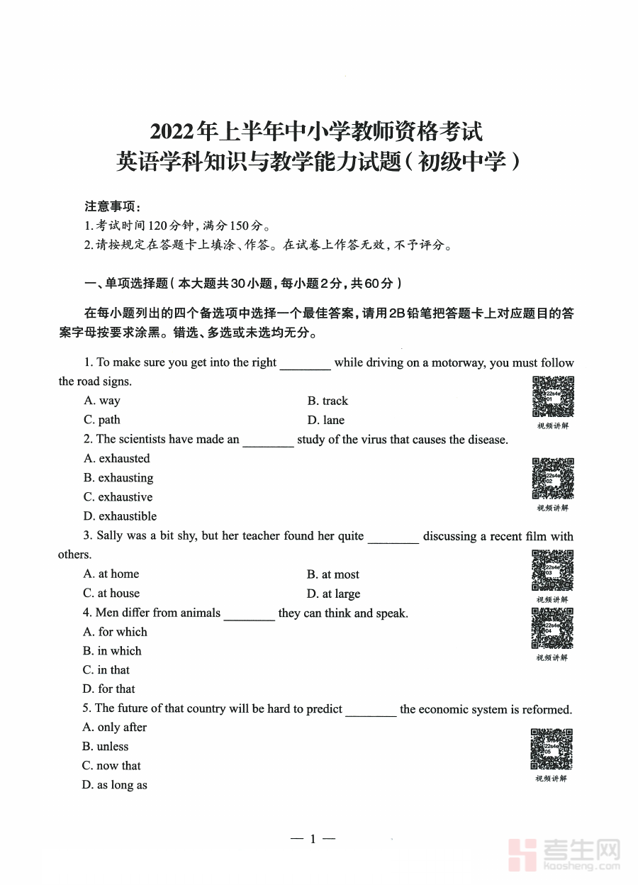《2022年上半年教师资格证考试《初中英语》题》是针对2022年上半年全国教师资格证初中英语学科考试设计的专业备考资料,它紧密贴合该年度该学段英语学科的官方考试要求与命题趋势,为考生提供了与实际考试场景高度匹配的练习素材,有助于考生提前熟悉考试的整体框架与考查方向,是考生备考过程中不可或缺的参考资料之一。