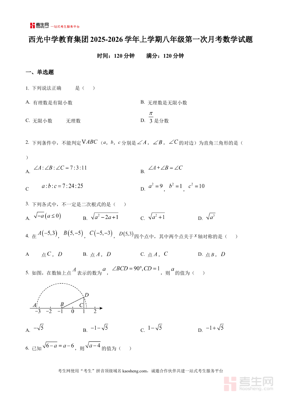 《精品解析:陕西省西安市新城区西光中学教育集团2025-2026学年八年级上学期10月月考数学试题(原卷版)》是针对陕西省西安市新城区西光中学教育集团内部设置的阶段性数学学业评估的备考资料。该资料对应的考试属于2025-2026学年第一学期八年级学生入学后的首次月度检测,覆盖集团内所有八年级学生群体,旨在通过标准化试题形式反映阶段学习考查重点与评估方向。作为原卷版资料,它完整保留该次月考数学试题的原始结构与呈现形式,为使用者提供与实际考试完全一致的试题载体,确保练习场景真实性。