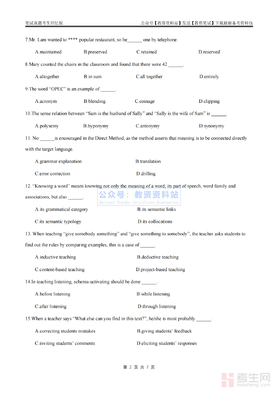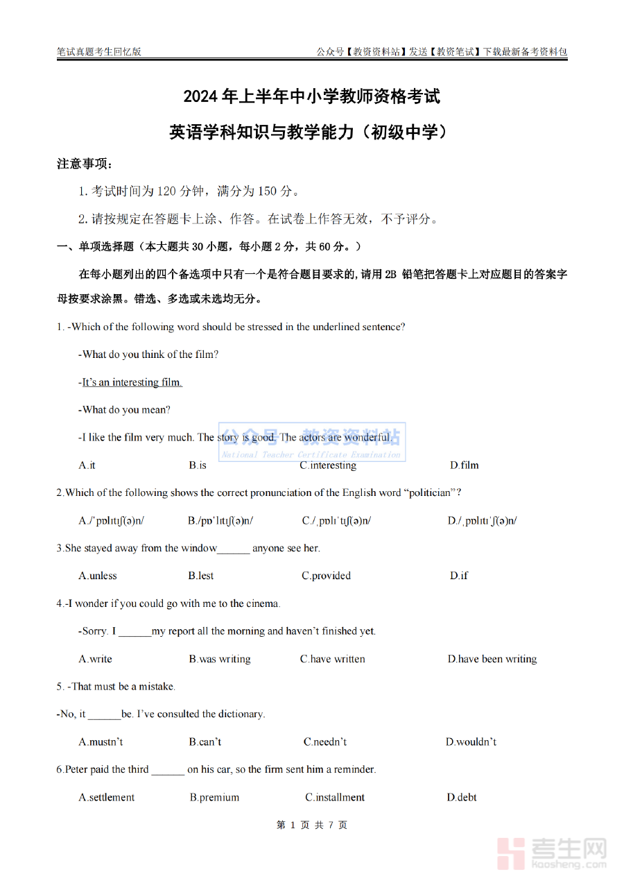 《2024上半年初中《英语》真题》是2024年上半年面向初中阶段英语学科的官方考试真题资料。作为反映该时期初中英语学业水平考查标准与方向的核心载体,它精准体现了当前初中英语教学评价的关键导向,为相关教学活动及备考准备提供了权威且直接的参考依据。