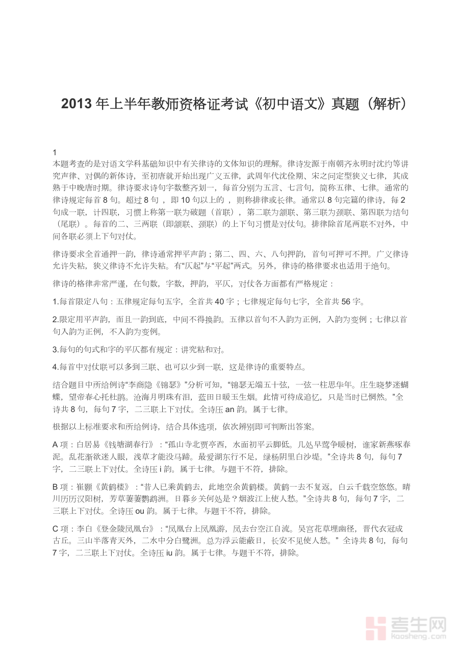 《2013年上半年教师资格证考试《初中语文》真题(解析)》是2013年上半年全国教师资格证考试初中语文科目的真题及配套解析资料。作为该时期初中语文教资考试的真实载体,它呈现了当年考试的命题逻辑、考查维度与能力导向,为备考者提供了贴近实际考试场景的学习资源。在教资备考体系中,历年真题及解析是核心性资料类型之一,能帮助使用者快速建立对考试形式与重点方向的认知,为后续针对性复习筑牢基础。