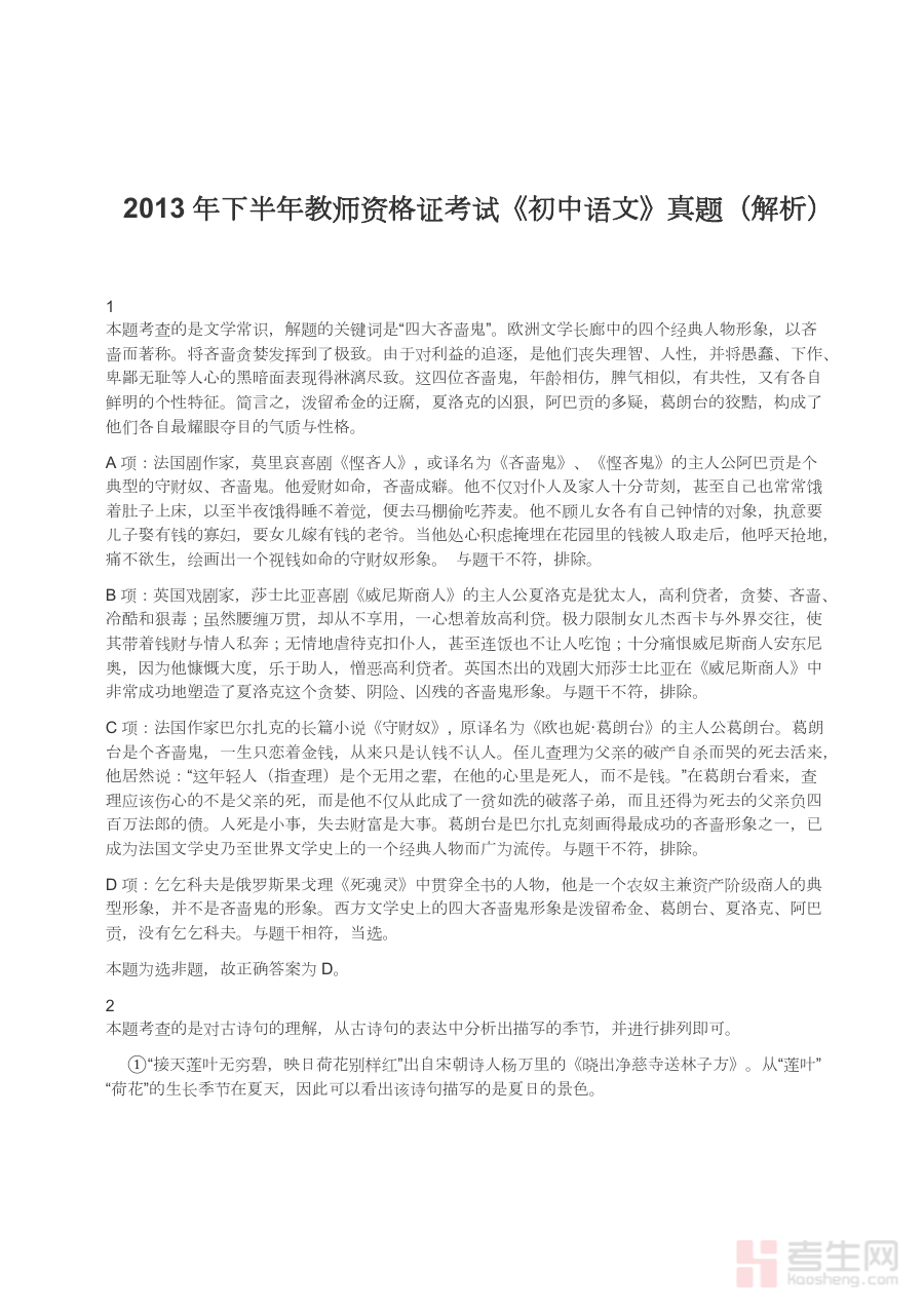 《2013年下半年教师资格证考试《初中语文》真题(解析)》是2013年下半年针对初中语文学科的教师资格证考试真题及配套解析资料,属于教师资格证考试备考体系中的核心资料类型之一,能够为备考者呈现该时期考试的真实命题形态与专业解析内容,是了解该次考试命题特征与考查方向的重要依据。