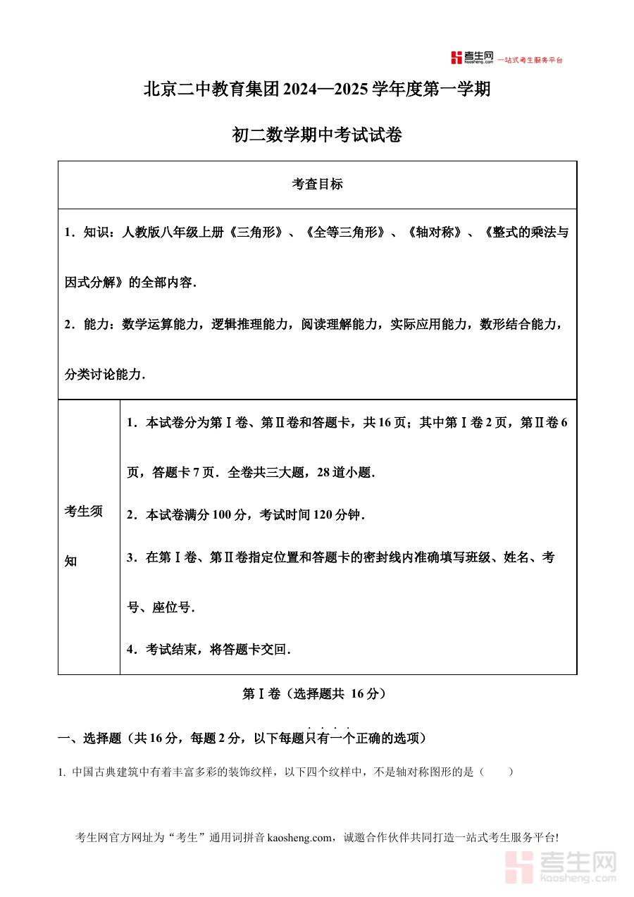 《精品解析:北京二中教育集团2024—2025学年上学期 八年级数学期中考试卷(解析版)》是针对北京二中教育集团在2024至2025学年上学期组织的八年级数学期中考试所编制的备考资料,其核心价值在于通过解析版内容为使用者提供该次考试的全面参考依据。作为区域内优质教育集团的期中测试资源,该资料能够精准反映该集团对八年级数学阶段性知识的考察重点与评价标准,为相关使用者搭建起连接日常学习与期中检测的桥梁。