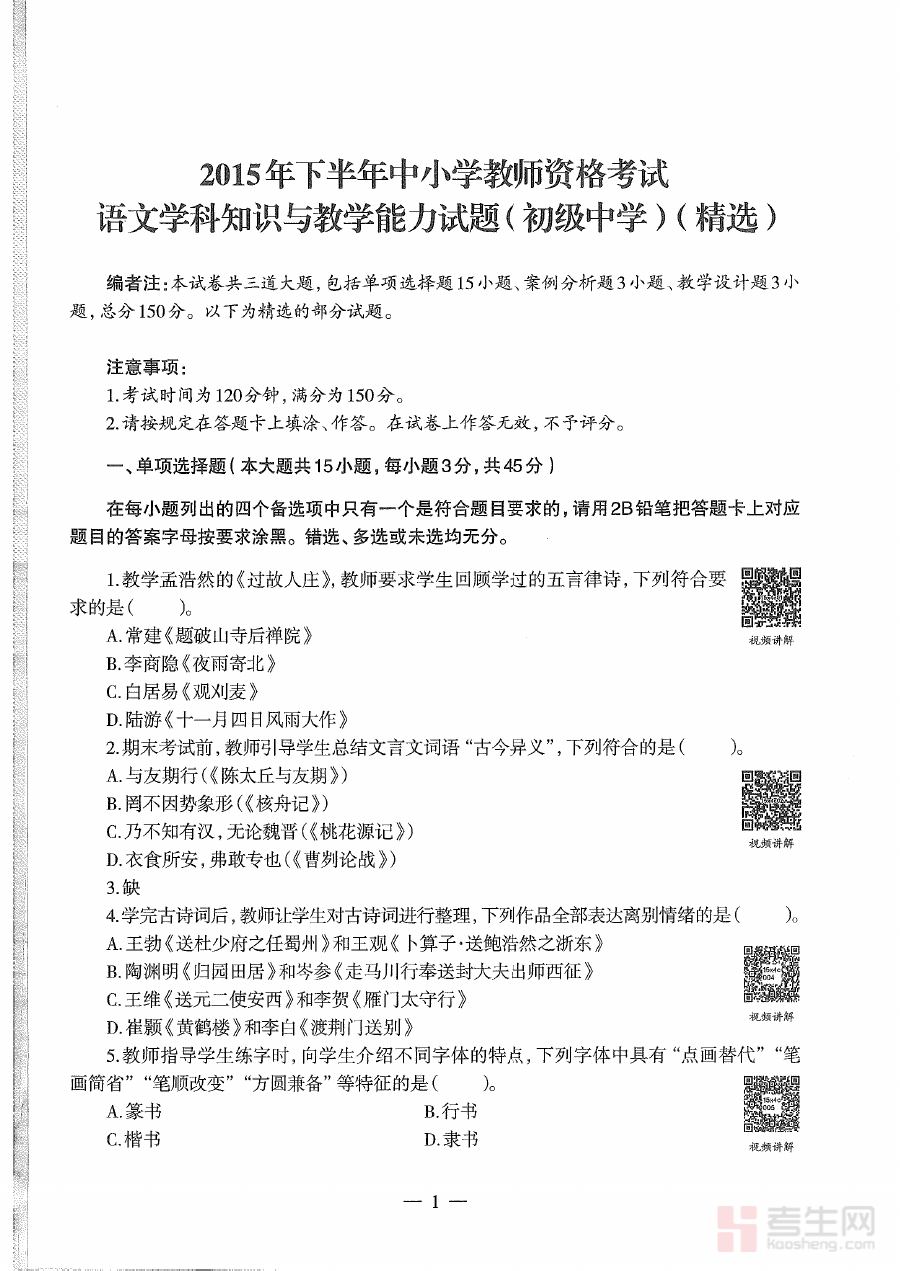 《2015年下半年教师资格证考试《初中语文》真题》是2015年下半年由教育部相关部门组织命题的初中语文学科教师资格准入考试的官方真题资料,属于全国统一开展的教师资格考试体系中的重要组成部分,能够精准反映该年度初中语文学科教师资格考试的命题逻辑、考查重点与能力要求,为备考者提供高度贴合实际考试情境的有效参考依据。