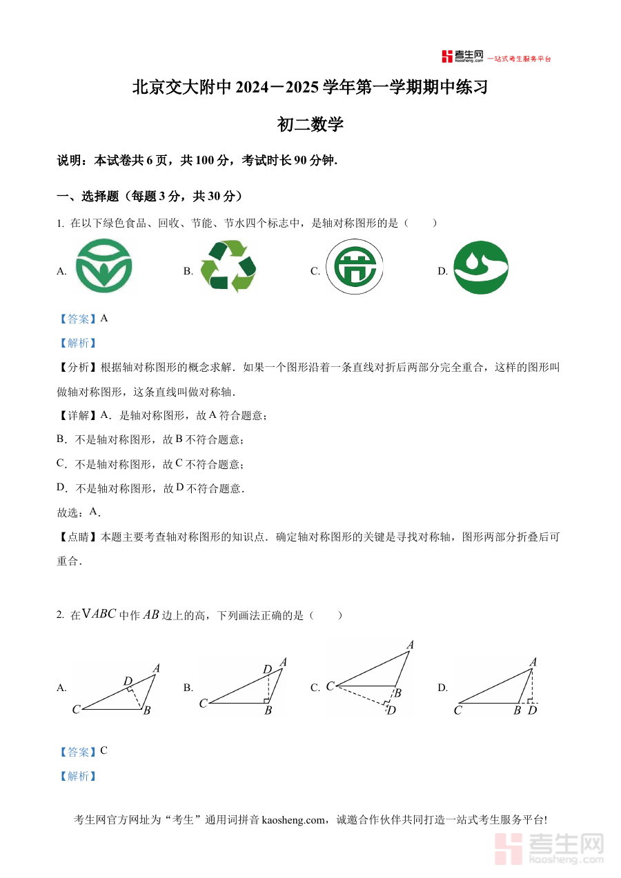 《精品解析:北京交通大学附属中学2024—2025学年八上学期期中数学试卷(解析版)》是针对北京交通大学附属中学特定学年学期的期中数学考试打造的备考资料,聚焦该校八年级上学期数学学科的期中检测需求,结合该阶段的教学进度与考试特点,为使用者提供了一份贴合实际教学场景的参考内容。