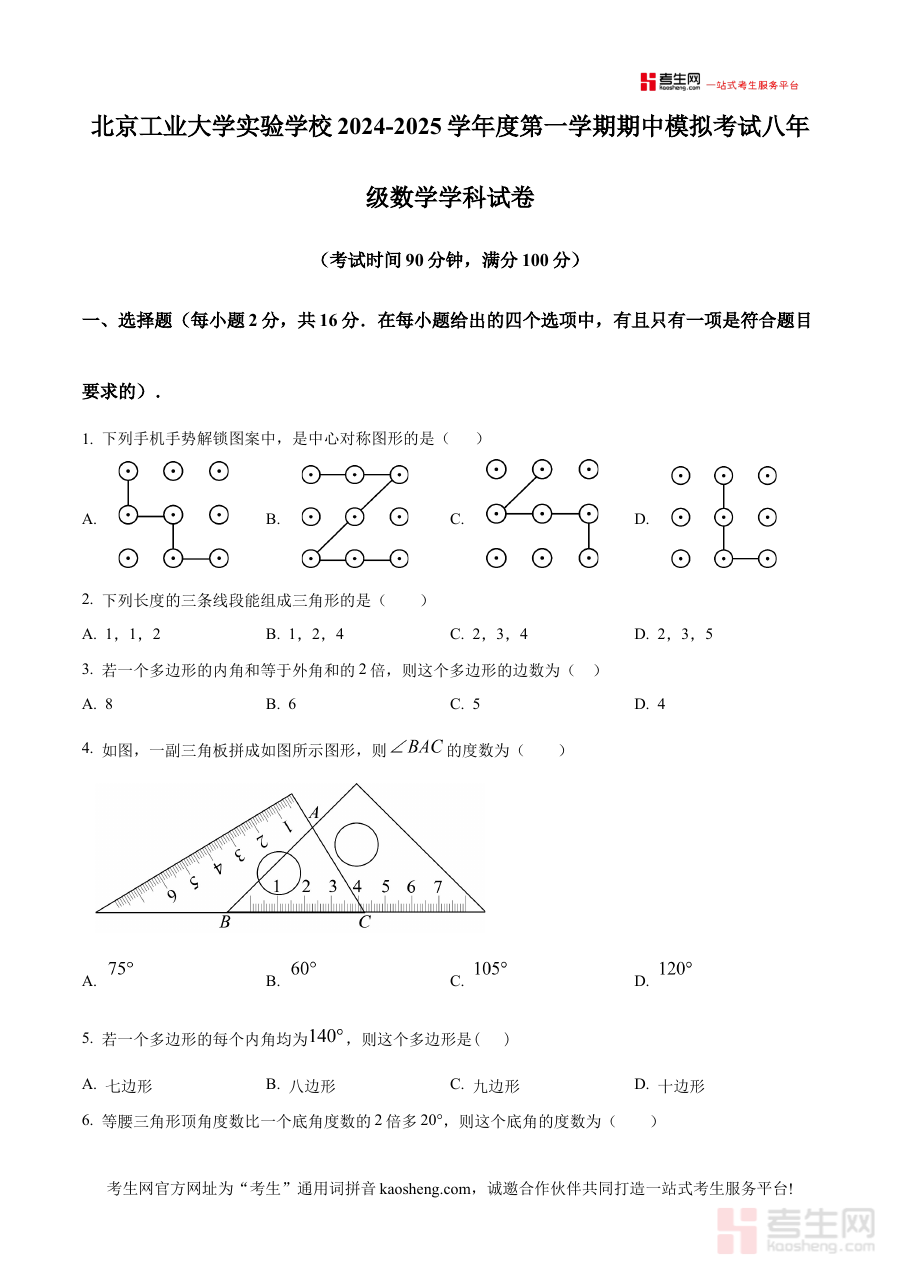 《精品解析:北京工业大学实验学校2024-2025学年上学期期中模拟考试八年级数学试卷(原卷版)》是北京工业大学实验学校针对2024-2025学年上学期八年级学生设计的期中模拟考试数学原卷资料。该资料紧密贴合该校八年级数学教学进度与阶段学习重点,依托本校教学实际情况编制,为学生提供与期中模拟考试高度匹配的备考资源,帮助学生提前适应本校期中模拟考试的整体框架与考查方向。