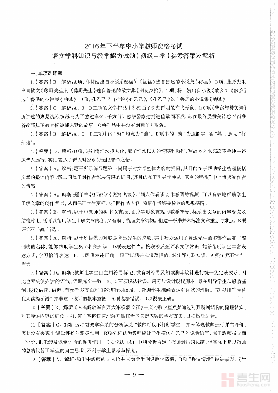 《2016年下半年教师资格证考试《初中语文》真题(解析)》是2016年下半年全国教师资格证考试体系中针对初中语文科目的标准化备考资料,包含该次考试的完整真题及专业解析内容,属于教师资格认证过程中重要的复习资源之一,能够直接反映当次考试的命题特点与考核要求,为考生提供贴近真实考试场景的复习素材。