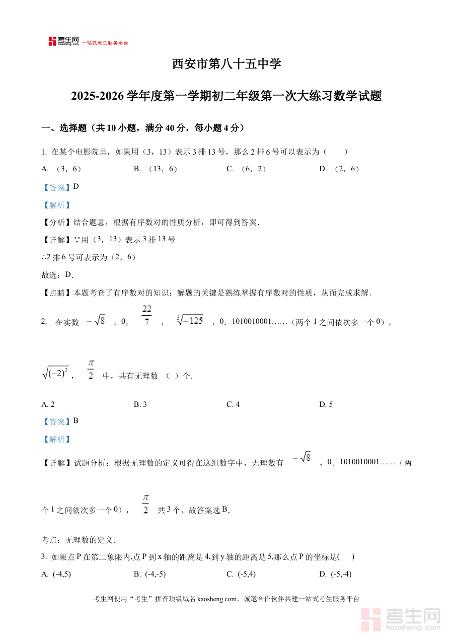 《精品解析:陕西省西安市第八十五中学2025-2026学年上学期八年级第一次大练习数学试题(解析版)》是针对陕西省西安市第八十五中学特定学年学期的八年级学生设计的数学学科阶段性练习试题解析资料。该资料对应学校2025-2026学年上学期八年级数学第一次大练习这一校内检测环节,紧密结合该校八年级数学的教学进度与阶段学习重点,为使用者提供了与校内实际练习完全匹配的专业解析内容,属于该校八年级学生阶段性数学学习的重要备考辅助资料。