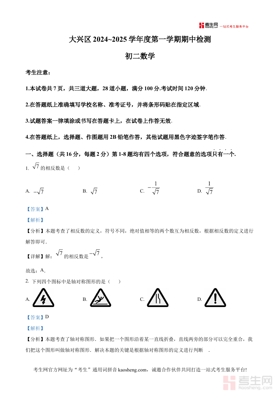 精品解析:北京市大兴区 2024—2025 学年上学期期中检测八年级数学试题(解析版)是针对北京市大兴区该学年上学期八年级数学期中检测的专业备考资料,明确了资料对应的时间范围、地域范围、学段学科及考试阶段属性,为使用者提供精准匹配该区域该学期期中检测的学习参考依据。