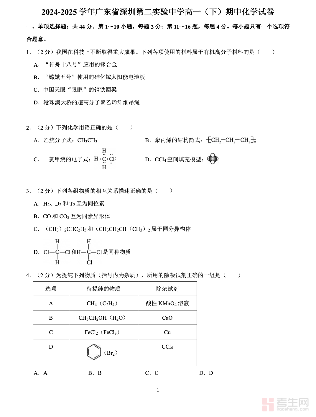2024-2025 学年广东省深圳第二实验中学高一(下)期中化学试卷,严格按照该校教学进度与深圳市高一化学统考要求命题,全面覆盖物质结构与元素周期律、化学反应速率与化学平衡、有机化学基础、常见无机物性质、化学实验基本操作等核心考点,题型包含选择题、填空题、实验探究题与综合计算题,难度梯度合理,贴合名校期中检测标准。试卷注重考查基础知识应用、实验分析能力、逻辑推理与规范答题能力,题目贴合课堂重点与高频考点,针对性强。适合高一学生用于期中复习自测、考点查漏补缺、模拟训练提升,快速掌握命题规律与解题思路,有效提高化学应试成绩。请添加微信 18617049513 进专属群,获取更多免费资源