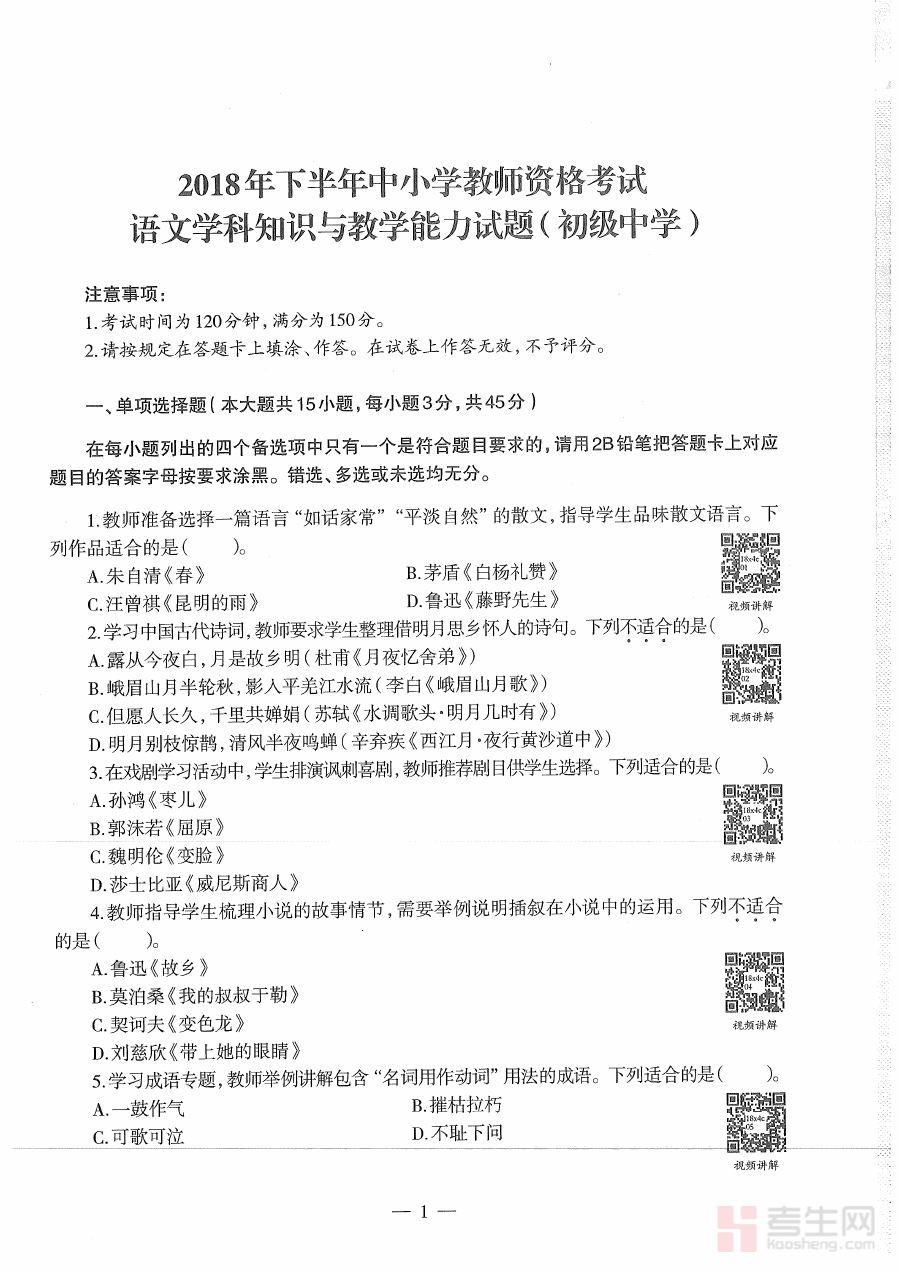 《2018年下半年教师资格证考试《初中语文》真题》是2018年下半年针对初中语文教师资格证考试的官方真题资料,属于全国性教师资格认证考试的重要备考资源,能够为考生提供该场次考试的真实命题方向与考查维度参考。