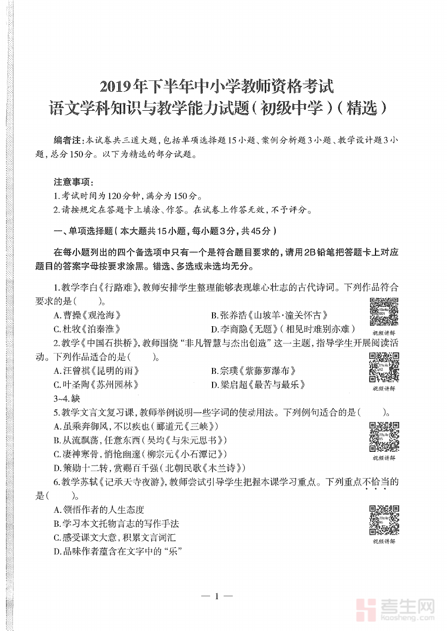 《2019年下半年教师资格证考试《初中语文》真题》是2019年下半年面向初中语文教师资格申请者的全国统一考试真题资料,属于教师资格证考试备考体系中的核心参考材料之一。该资料直接反映了当次考试的命题方向与考查框架,为备考者提供了贴合真实考试场景的内容载体,是了解初中语文学科教师资格考试具体要求、标准与考查重点的重要依据。通过对该真题的研究与使用,备考者可直观感受考试的整体结构与命题思路,为后续的系统备考明确方向与重点。