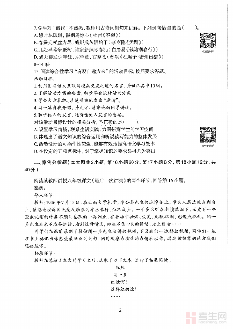 该真题资料可用于备考者进行自我学情诊断,帮助其清晰认知自身对初中语文学科教师资格考试相关内容的掌握程度与薄弱环节;同时,备考者可基于真题的命题逻辑与考查倾向分析制定更具针对性的备考规划,合理分配学习时间与精力到核心考点上;此外,将该真题作为阶段检测工具使用能模拟真实考试环境与流程,提升应试能力与时间管理技巧,为正式考试做好充分的实战准备。