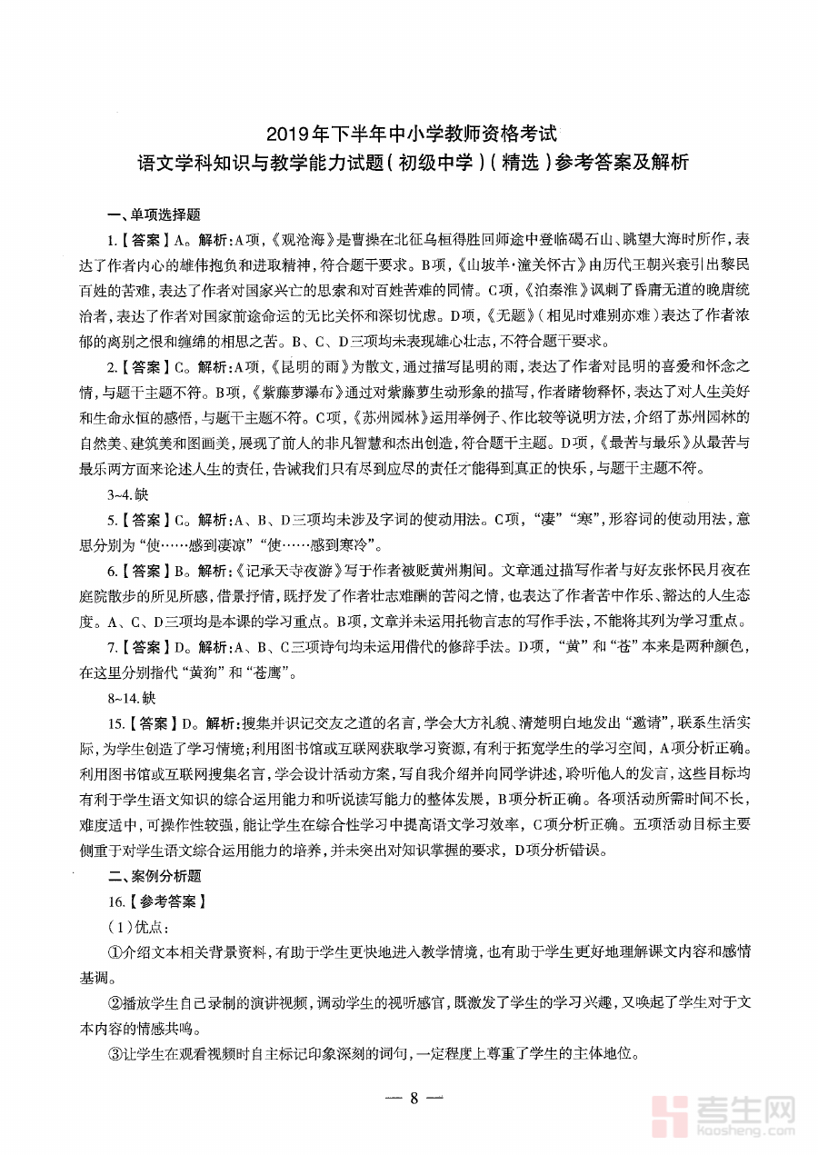 此资料适用于有志于获取初中语文教师资格的备考考生,尤其适合需要了解2019年下半年考试命题特点的群体。它能帮助考生熟悉考试形式与评分标准,提升应试能力,对于复习中后期的考生而言,通过解析内容深化考点理解,可为正式考试奠定坚实基础。