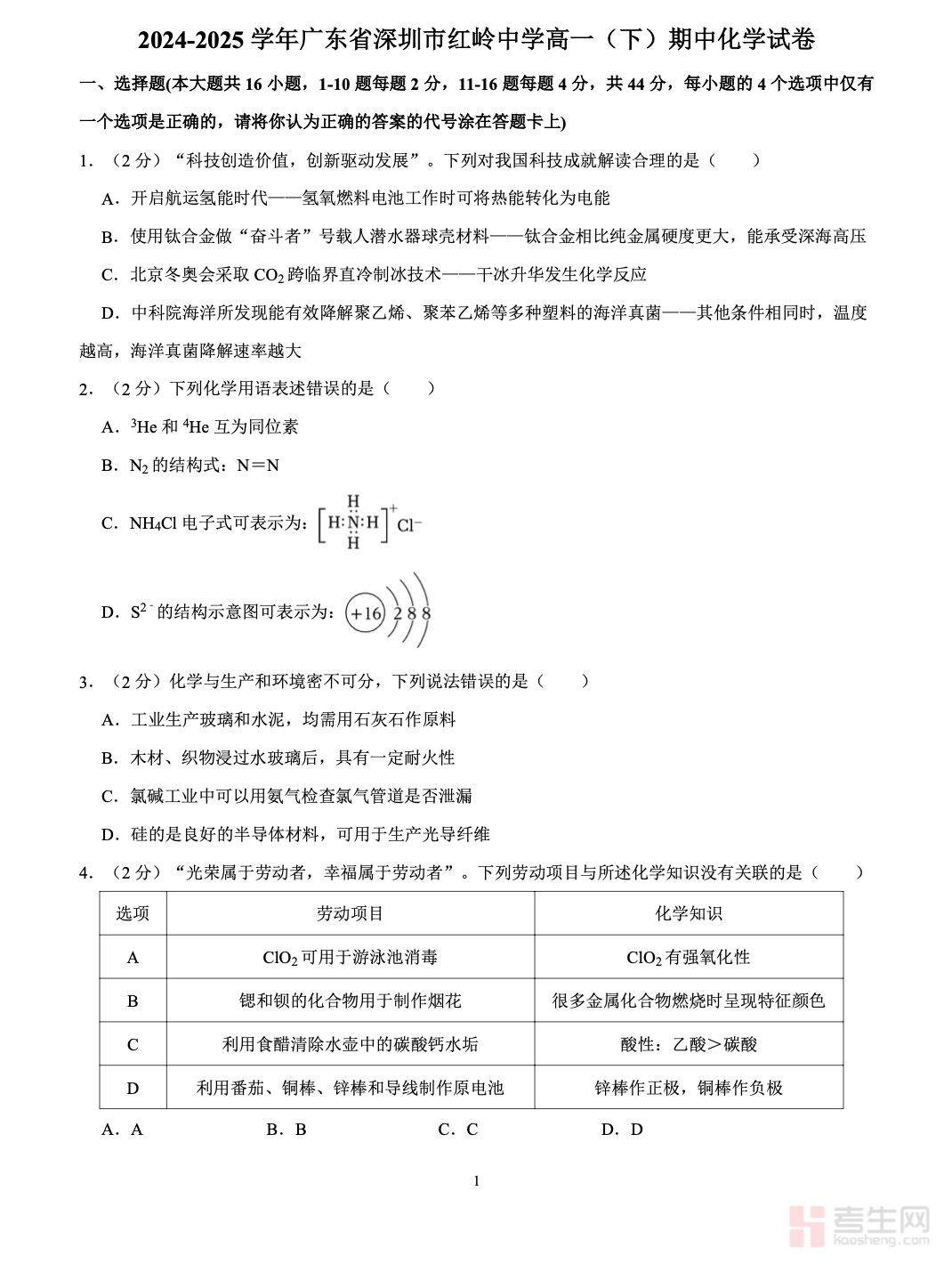 2024-2025 学年广东省深圳市红岭中学高一(下)期中化学试卷,紧扣该校教学进度与深圳市高一化学统考标准,全面覆盖物质结构与元素周期律、化学反应与能量、有机化学基础、常见无机物性质、化学实验探究等核心考点,题型包含选择题、填空题、实验题与综合计算题,难度梯度合理,贴合重点高中命题特点。试卷注重考查基础知识应用、实验分析能力、逻辑推理与规范答题能力,题目贴合课堂重难点与高频易错点,针对性强。适合高一学生用于期中复习自测、考点查漏补缺、模拟训练提升,精准把握名校命题规律,有效提高化学应试水平。请添加微信 18617049513 进专属群,获取更多免费资源