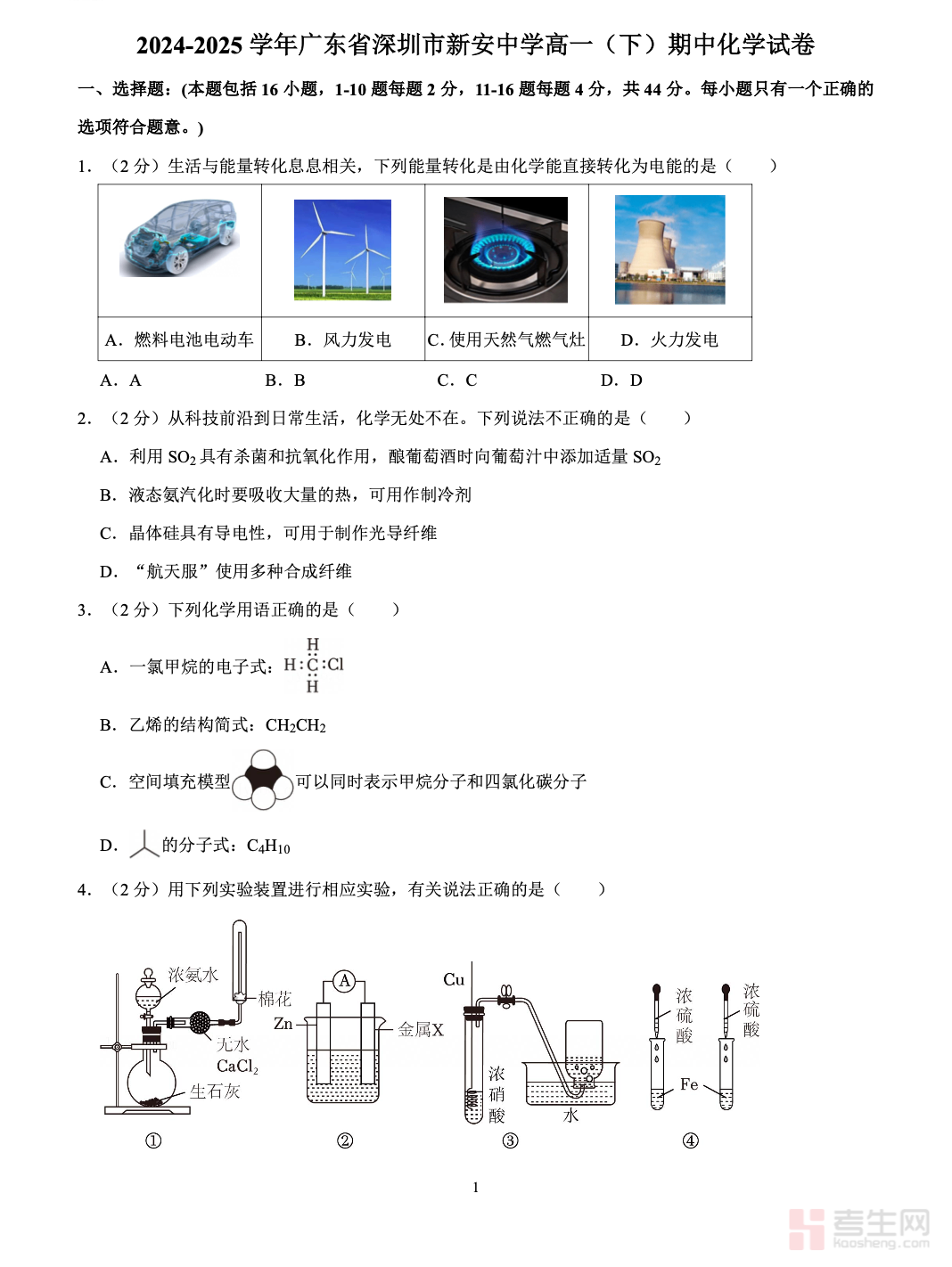 2024-2025 学年广东省深圳市新安中学高一(下)期中化学试卷,严格按照学校教学进度与深圳市高一化学课程标准命题,全面覆盖物质结构与元素周期律、化学反应速率与化学平衡、有机化合物基础、常见无机物性质及转化、化学实验基础等核心考点,题型包含选择题、填空题、实验探究题和综合计算题,难度适中且梯度清晰,贴合校内期中检测要求。试卷注重考查学生基础知识掌握、实验分析能力、知识迁移运用及规范答题能力,考点贴合课堂重难点,实用性强。适合高一学生进行期中复习自测、查漏补缺、模拟训练,快速掌握考点与解题思路,提升化学应试能力。请添加微信 18617049513 进专属群,获取更多免费资源