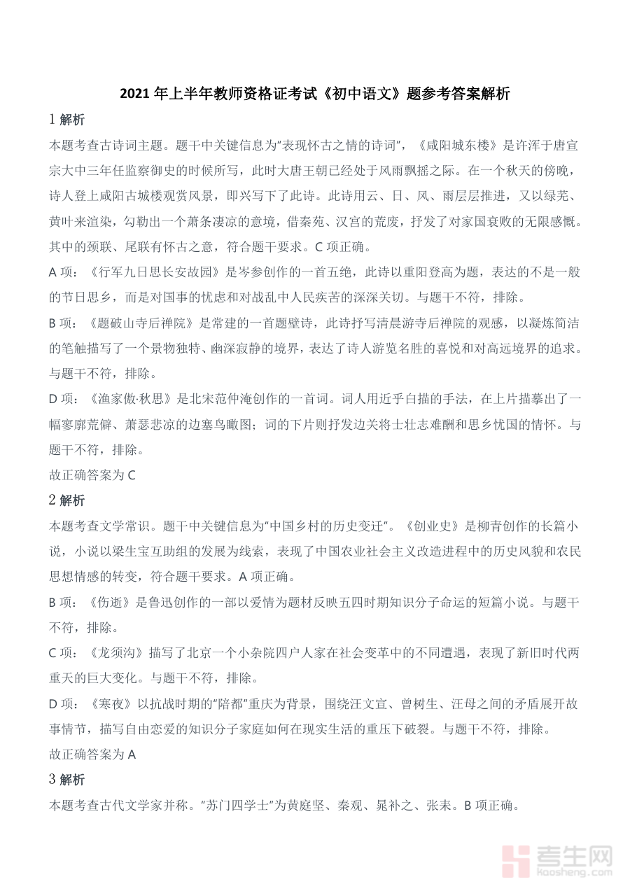 《2021年上半年教师资格证考试《初中语文》真题(解析)》是2021年上半年面向初中语文教师资格申请者发布的官方考试真题及配套解析资料,具有较高的权威性和参考价值。作为教师资格证考试体系中针对初中语文科目的核心备考资源,该资料精准对应初中语文科目考试的核心框架与考查方向,为备考者提供了与真实考试场景高度一致的练习素材,是了解考试命题特点、内容结构及评分标准的关键参考依据。
