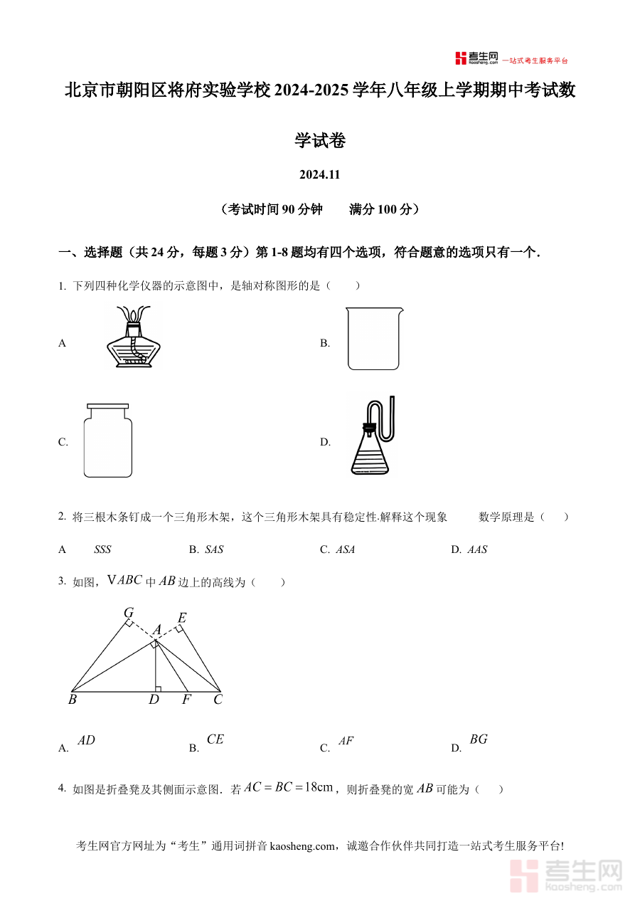《精品解析:北京市朝阳区将府实验学校2024-2025学年八年级上学期期中考试数学试卷(原卷版)》是针对北京市朝阳区将府实验学校2024-2025学年八年级上学期数学期中考试设计的备考资料,精准对应该学年该阶段的数学学科期中检测场景,为使用者提供与实际考试匹配的原卷内容支持。