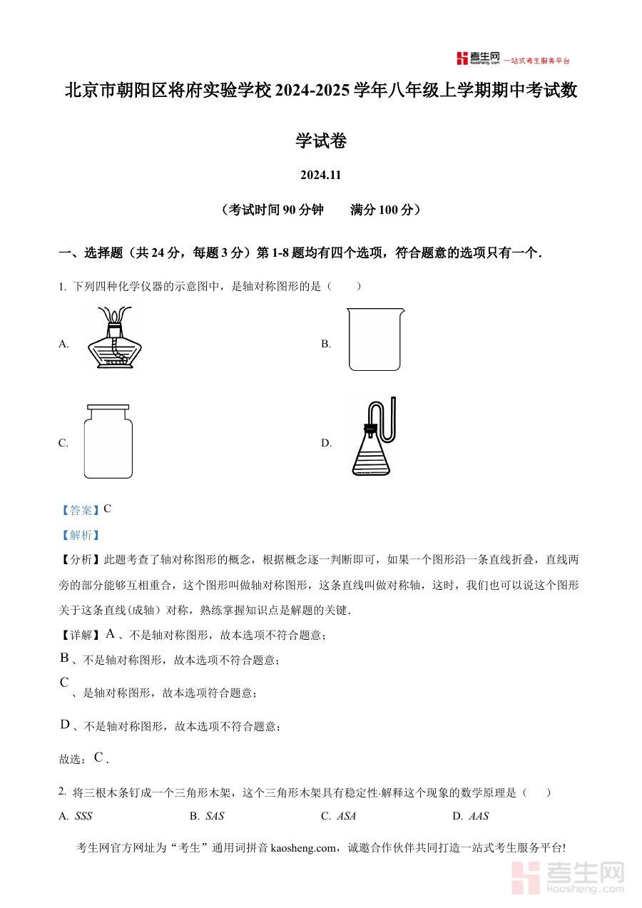 《精品解析:北京市朝阳区将府实验学校2024-2025学年八年级上学期期中考试数学试卷(解析版)》是面向北京市朝阳区将府实验学校特定学年段的数学学科阶段性考试配套资料,精准对应2024-2025学年八年级上学期期中考试的时间节点与校考需求,作为解析版资料,它不仅呈现试卷内容框架,更包含对考试相关考点及答题思路的深度解读,为使用者提供贴合该校考试实际的备考指导与方向参考。