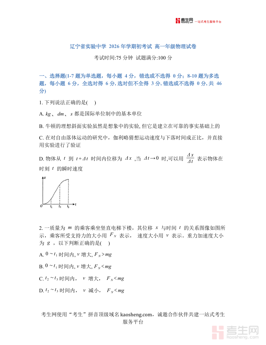 《辽宁省实验中学2026年2月高一下学期期初试卷物理(含答案)》是辽宁省实验中学在2026年2月针对高一下学期期初阶段推出的物理学科检测资料,属于高中物理阶段性考试相关的备考资源。该资料结合学校教学进度与高一物理学科的阶段性学习目标设计,能够反映出新学期初始阶段物理学科的核心检测方向,为学生提供贴合当前学习阶段的练习依据。