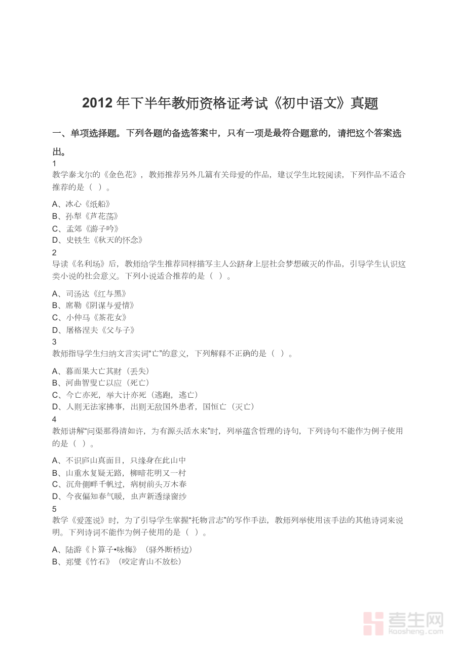 《初中语文真题一键打印版12下-23下》是涵盖2012年下半年至2023年下半年期间初中语文考试真题的备考资料集合。该资料以真题为核心内容载体,聚焦初中语文考试的实际命题方向与考查重点,为使用者提供具有时效性和参考价值的备考素材,帮助使用者对接考试实际需求,构建与考试要求相匹配的知识框架与能力体系。