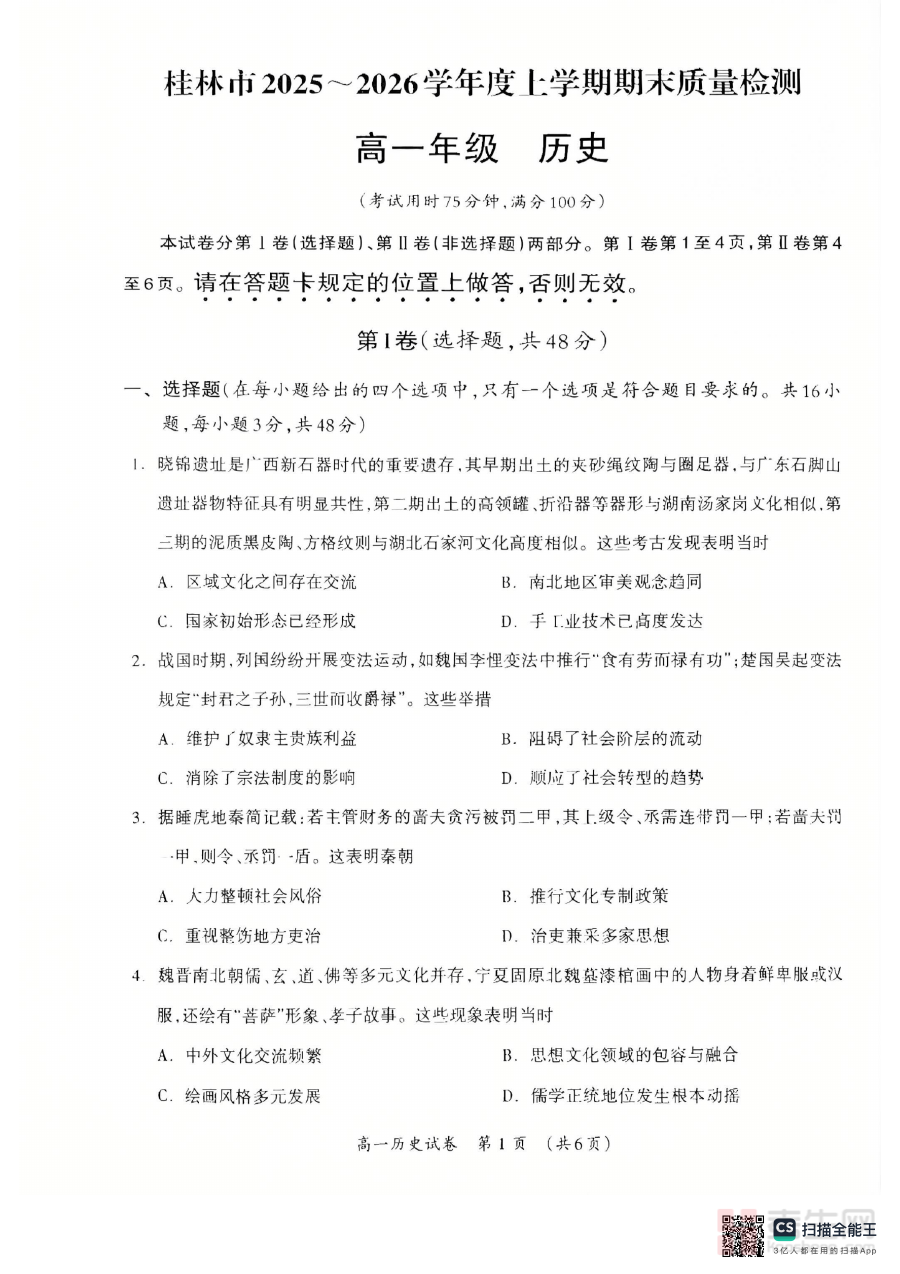 本资料主要适用于广西省桂林市2025-2026学年度上学期的高一学生群体,同时也可为该学段的历史教师提供教学参考及命题方向分析依据,以及为家长辅助孩子复习提供清晰的方向指引。对于学生而言,通过该资料能明确期末复习的核心目标,借助参考答案规范答题思路与得分要点;对于教师和家长,可通过资料把握当地期末检测的评价导向,助力学生进行高效的阶段复习与备考规划,提升学习成果的转化效率。