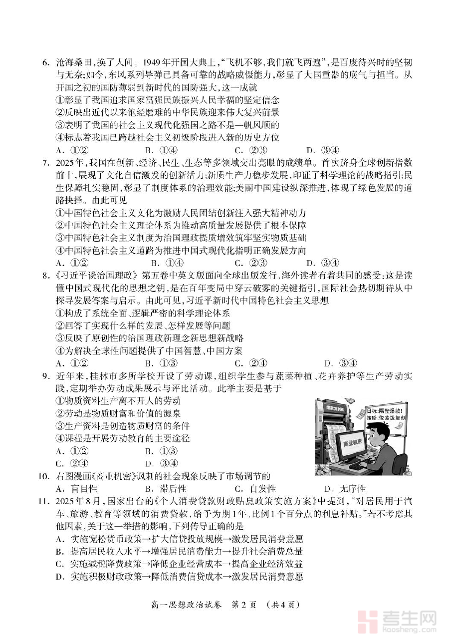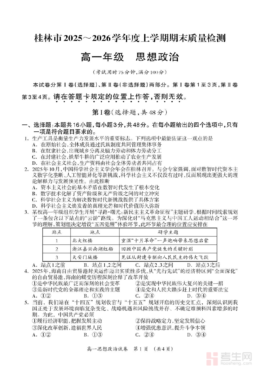 本试题适用于桂林市2025-2026学年度上学期在读的高一年级学生及相关思想政治学科教师;通过使用该试题进行阶段检测,学生能熟悉期末考的命题方向与考查形式以提升备考效率,教师则可借助试题结果优化教学策略。