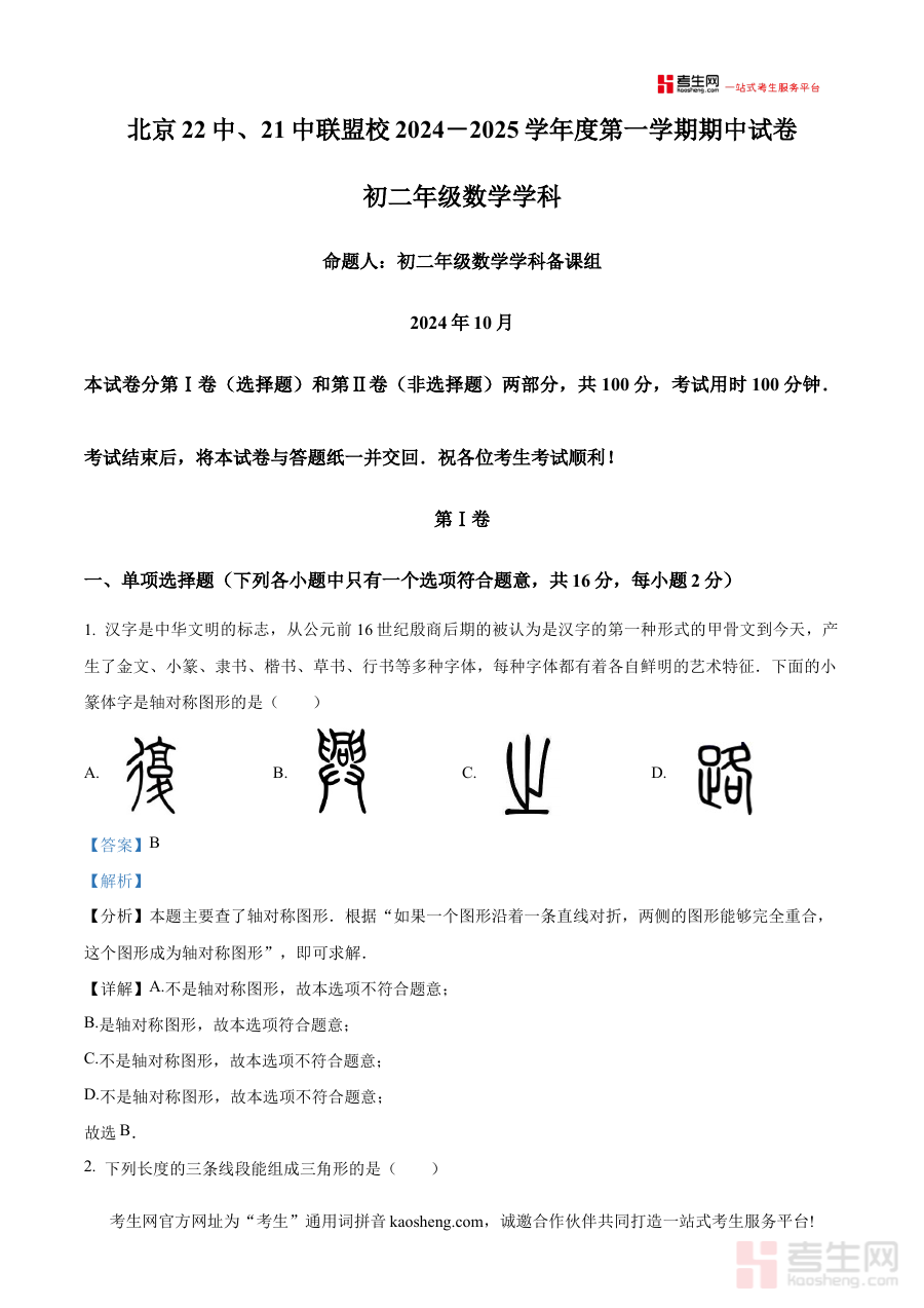 《精品解析:北京市第十二中学,第二十一中学联盟2024-2025学年八年级上学期期中数学试卷(解析版)》是2024-2025学年北京市第十二中学与第二十一中学联盟针对八年级上学期期中数学考试推出的专业解析类备考资料,聚焦联盟校期中数学考试的核心考查方向,为使用者提供系统且精准的解析支持,助力把握期中数学考试的内容要求与评价标准。