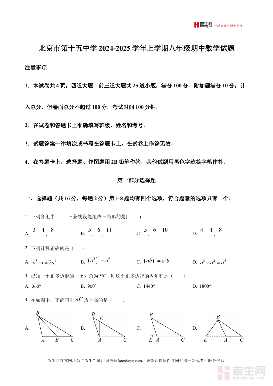 《精品解析:北京市第十五中学2024-2025学年上学期八年级期中数学试题(原卷版)》是针对北京市第十五中学2024至2025学年上学期八年级期中数学考试的配套备考资料,聚焦该阶段数学学科的期中检测需求,为使用者提供贴合学校教学进度与考试要求的原卷资源。